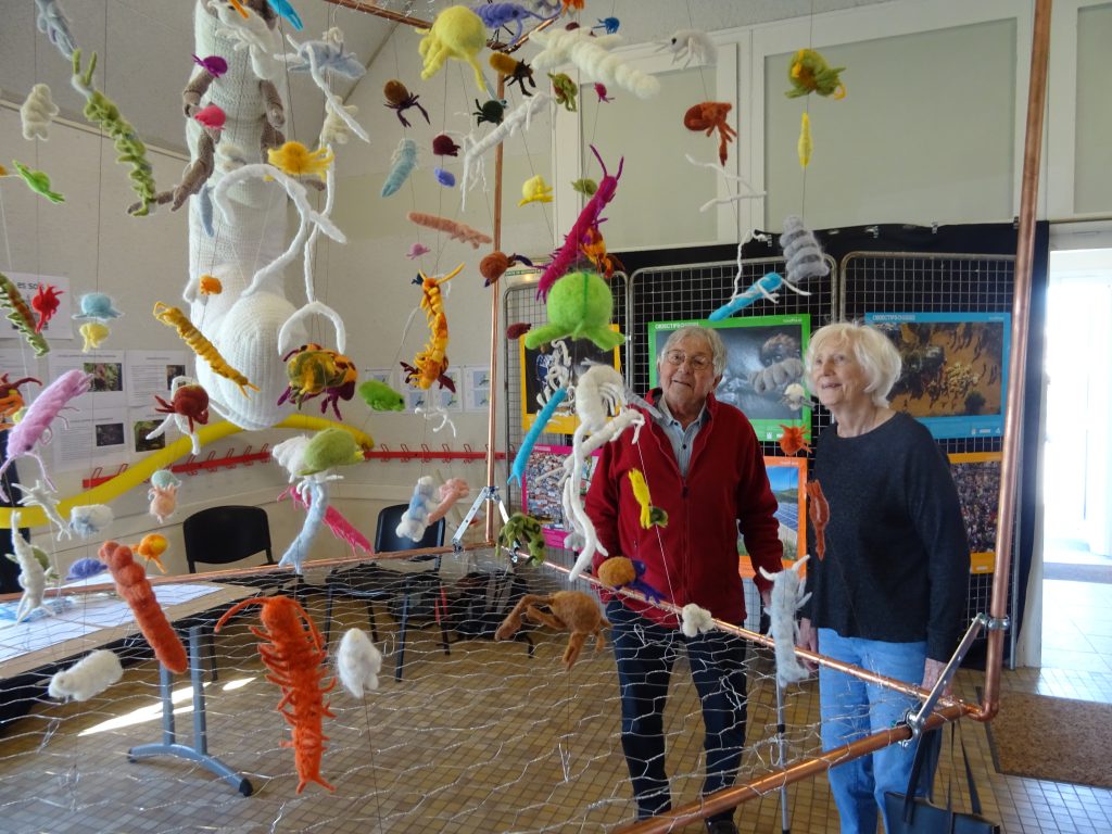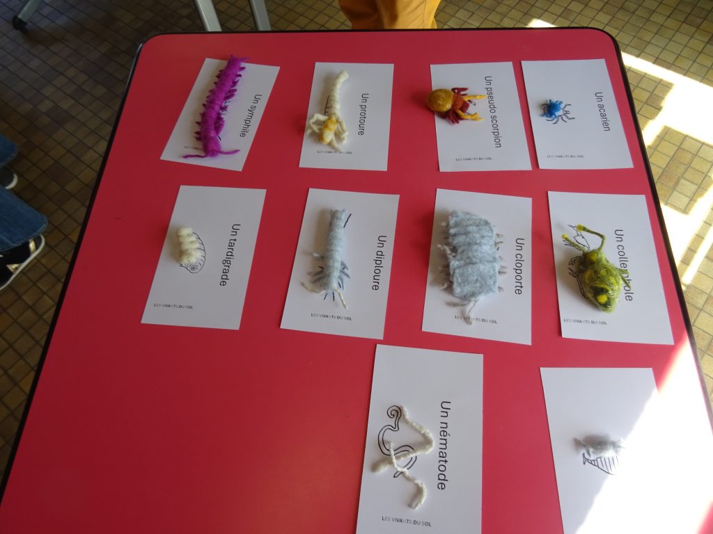 La faune du sol est très largement méconnue. Nous avons voulu mélanger science et art pour la faire découvrir, en représentant environ 200 animaux de la mésofaune. L’échelle de la larve de carabe sert à appréhender la taille réelle.